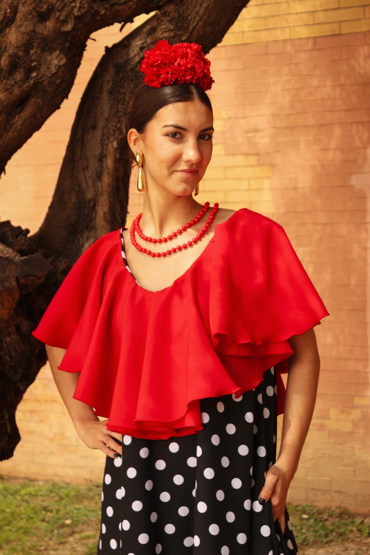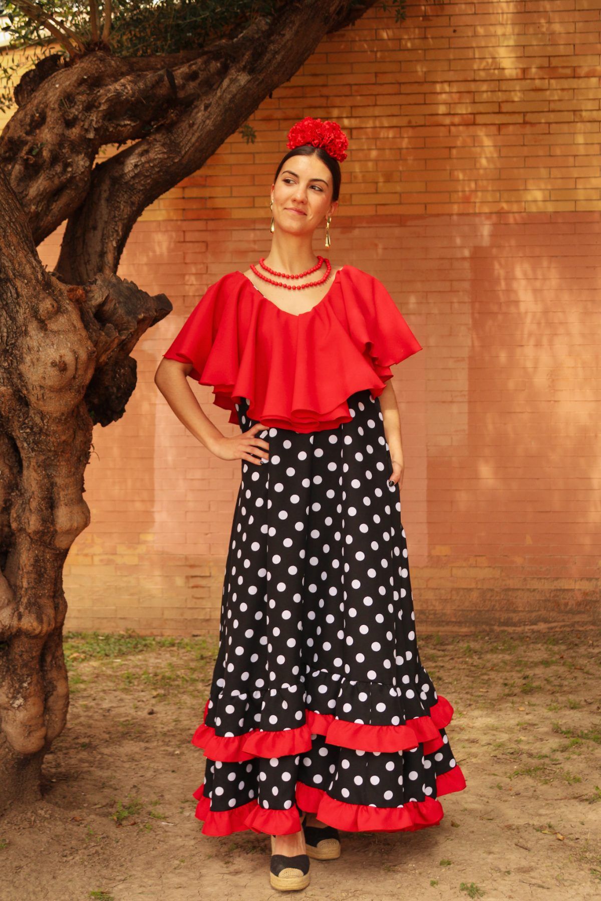 Bata rociera con doble volante en el bajo y volante grande en el escote.