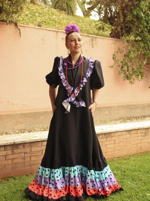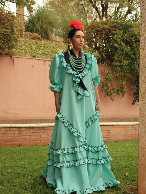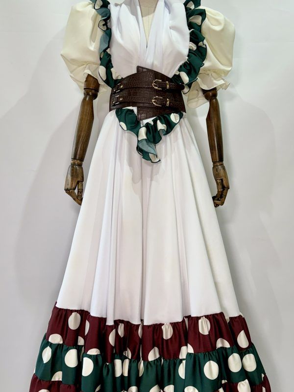 Conjunto mantoncillo y falda canastera blanca combinada burdeos y verde